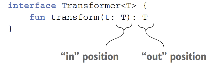 즉, 클래스 멤버를 선언할 때 타입 파라미터를 사용할 수 있는 지점은 모두 인(in)과 아웃(out)위치로 나뉜다. 만약 T가 함수의 반환 타입에 쓰인다면 T는 아웃 위치에 있다. 그 함수는 T 타입의 값을 생산한다. T가 함수의 파라미터 타입에 쓰인다면 T는 인 위치에 있다.