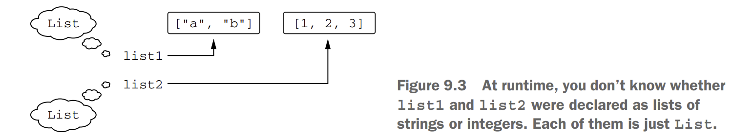 컴파일러는 두 개의 리스트가 다른 타입이라는 것을 알지만, 실행 시간에는 두 개가 서로 같게 보인다. 물론 List<String>에는 오직 문자열만 있어야 하며, List<Int>에는 오직 정수만 있어야 한다. 왜냐하면 컴파일러는 올바른 타입인 인자만 리스트에 저장되도록 만들기 때문이다.