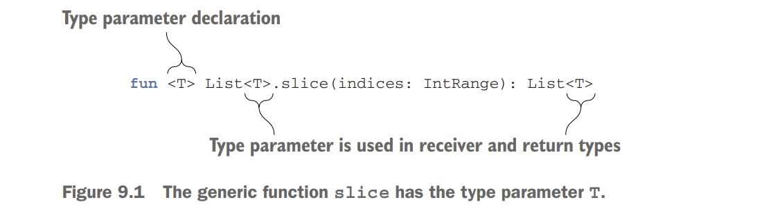 위의 slice 함수를 호출할 때는 타입 인자를 명시적으로 표현해야 한다. 그러나 많은 경우 컴파일러가 이를 추론하기 때문에 그럴 필요가 없다. 예를 들어, letters.slice(10..13)와 같이 호출한다면 컴파일러는 타입 파라미터 T가 Char라는 것을 자동으로 추론한다. 즉, letters.slice<Char>(0..2)처럼 직접 명시해 줄 필요가 없다.