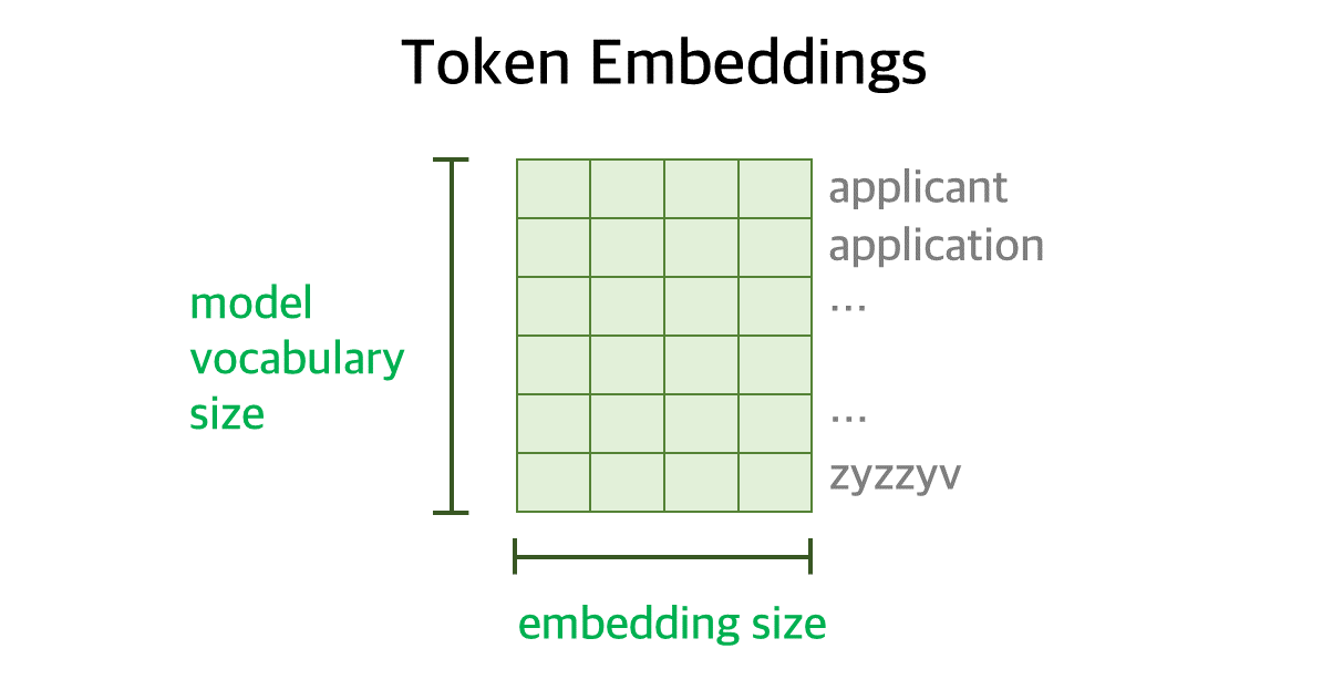 이렇게 만들어진 토큰은 벡터화된다. 벡터화란 문자열 데이터인 토큰을 숫자로 수치화하는 것인데, 단순히 인덱싱이 아니라 각 토큰의 의미와 연관성을 고려하여 수치화된다. 그 결과로 서로 비슷한 의미를 가지고 있는 토큰끼리는 서로 비슷한 임베딩을 가지게 되며, 서로 연관성이 없는 단어는 유사하지 않은 임베딩을 가지게 된다. 예를 들어 "applicant"와 "application"이라는 단어는 서로 임베딩이 비슷하고, "applicant"와 "zyzzyv"는 서로 임베딩이 많이 달라진다.