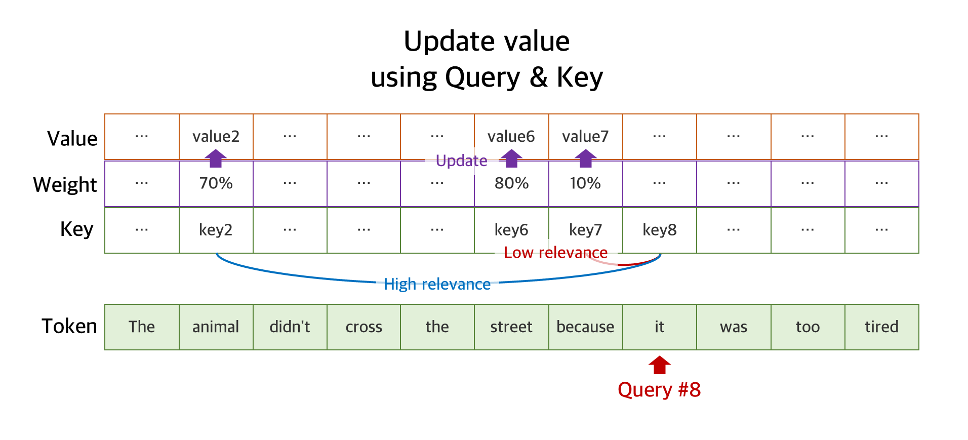 - 모든 토큰에 대한 검사가 이루어지면, 토큰의 현재 값(Value)은 결과적으로 "모든 토큰이 다른 모든 토큰들에 대해서 얼마나 연관성이 있는지" 알 수 있는 값으로 업데이트 된다.