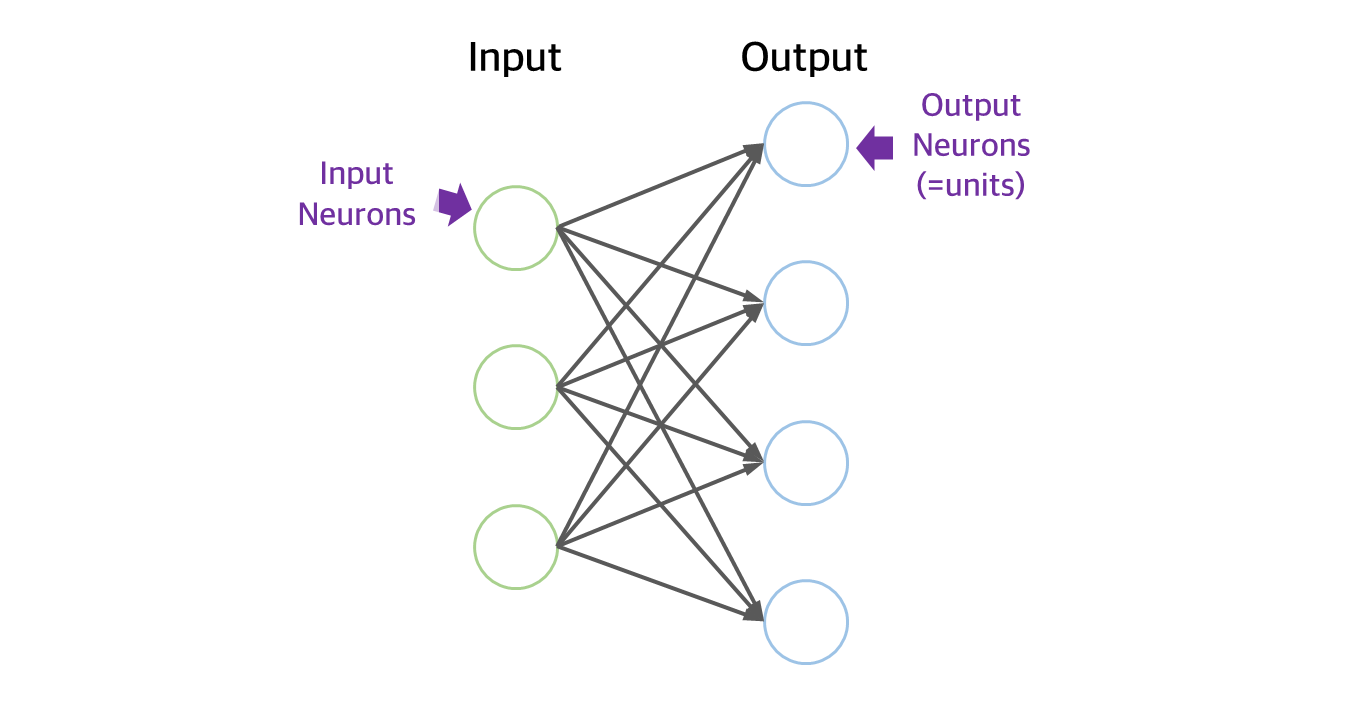 Dense 레이어는 입력과 출력을 모두 연결해주는 fully-connected layer이다. 이렇게 모두 연결된 모습이 조밀(dense)하기 때문에 Dense 레이어라고 부른다. 해당 레이어는 output = activation(dot(input, kernel) + bias) 연산을 수행한다. 가장 일반적인 input tensor는 (batch_size, input_dim) shape의 2D 텐서이지만, (batch_size, ..., input_dim) shape의 N-D 텐서도 가능하다. ouput tensor는 2D인 경우 (batch_size, units)이고, N-D인 경우 (batch_size, ..., units)이다. 즉, units에 따라서 output의 모양이 달라진다. 여기서 units란 출력 공간의 차원으로, output neuron의 수를 의미한다. units의 수가 많아지면 모델이 복잡해지고 표현력이 증가하지만, 그만큼 overfitting의 위험성도 증가한다.