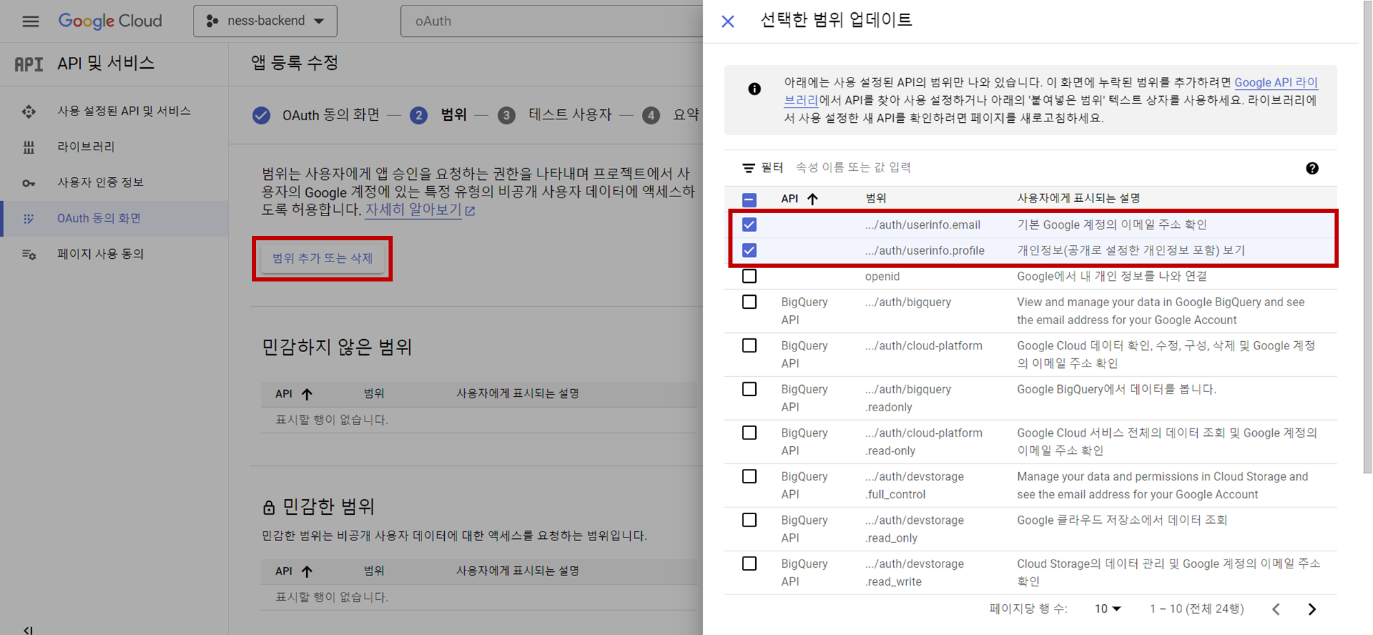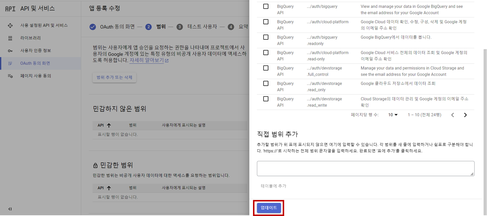 이 OAuth 인증이 어떤 범위의 데이터를 가져올 수 있는지를 설정해준다. OAuth 인증이 이루어지면 리소스 서버에서 다양한 데이터를 가져올 수 있다. 내 서비스에서는 추가적인 데이터 말고, 기본적인 이메일 주소 및 개인 정보만 가져와서 로그인/회원가입만 할 것이므로, 범위를 .../auth/userinfo.email과 .../auth/userinfo.profile 두 개로 설정해준다.