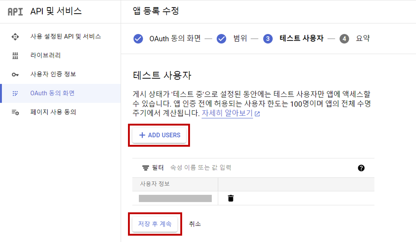 그 후에 테스트시 사용할 구글 계정을 등록해준다. 프로덕션으로 출시하기 전에는 여기서 등록한 테스트 사용자만 이 OAuth 인증을 쓸 수 있다. 개발할 때 사용할 테스트 계정을 등록해준다(나중에 추가할 수도 있으므로, 지금 반드시 설정하지 않아도 된다).
