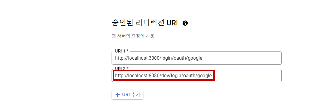 그 후 리디렉션 URI를 만들어준다. 여기서 중요한게, 이 리디렉션은 프론트엔드와 백엔드 API 경로 둘 다 만들어야 한다. 그 이유는 원래는 프론트엔드로 리디렉트해야 하지만, 백엔드 개발자가 테스트하기 위해서는 리디렉션 URI에 백엔드 서버 API 경로도 있어야 하기 때문이다.