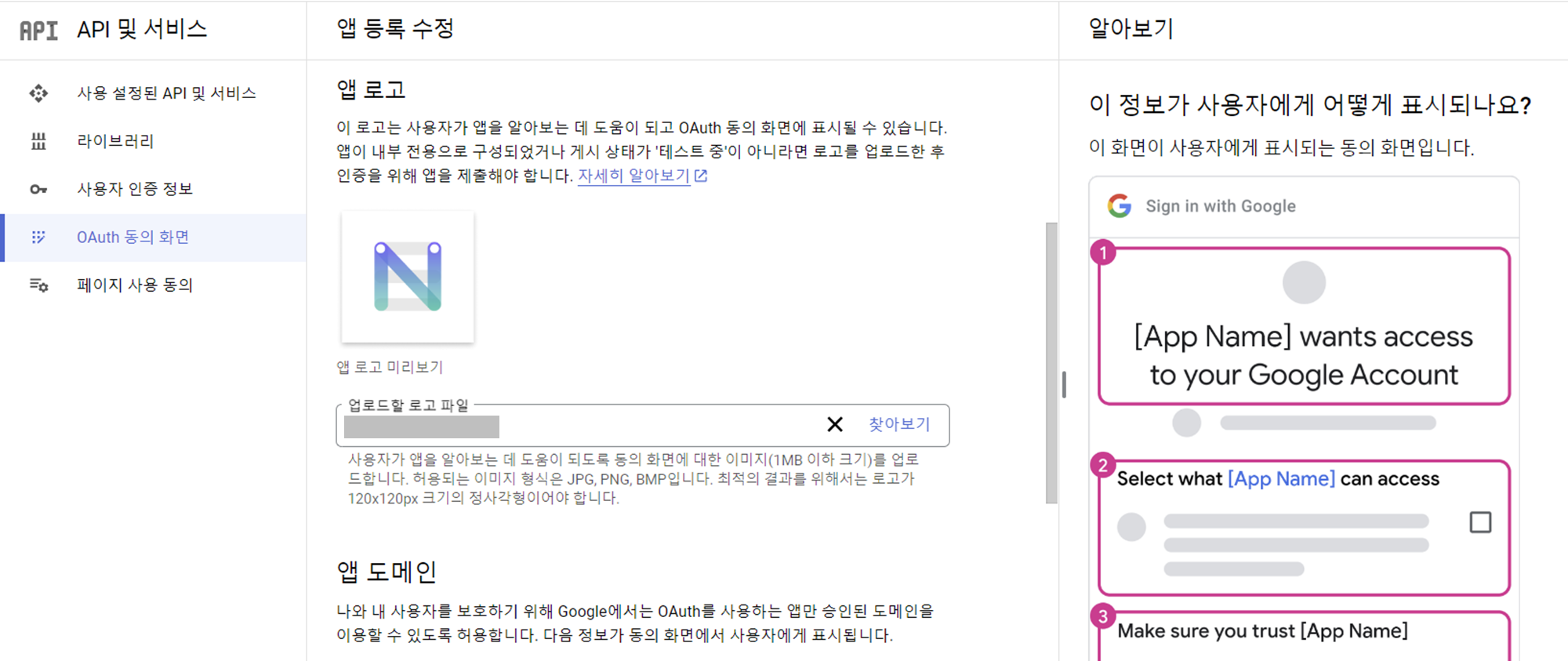 엡에 대한 정보를 입력한다. 이 정보는 구글 로그인 시 사용자에게 제공되는 정보이다. 앱 이름과 사용자 지원 이메일, 개발자 연락처 정보는 필수적으로 입력한다.