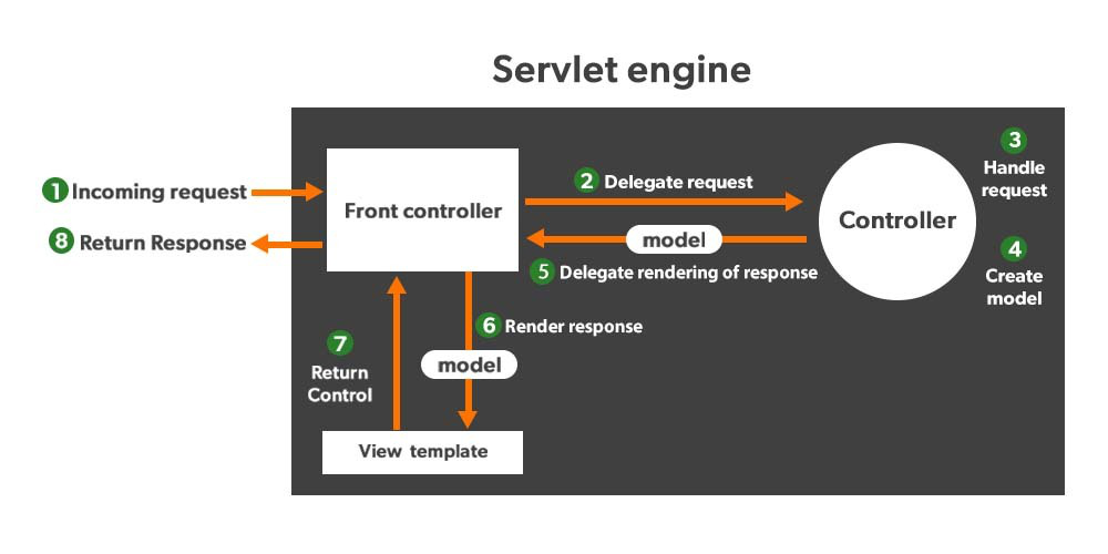 Spring MVC에서 프론트 컨트롤러는 다음과 같은 방식으로 작동한다. Spring MVC에서 서버 사이드 랜더링까지 하는 상황이라고 했을 때, controller로(@Controller 어노테이션이 붙은 클래스) 사용자의 request를 보내고, 그에 대한 데이터를 model로 받은 다음, view 템플렛(여기서는 .jsp)을 찾아서 model 데이터를 전달하고, 그 결과로 파싱된 데이터를 받아서 최종적으로 response하는 게 프론트 컨트롤러의 역할이었던 것이다.