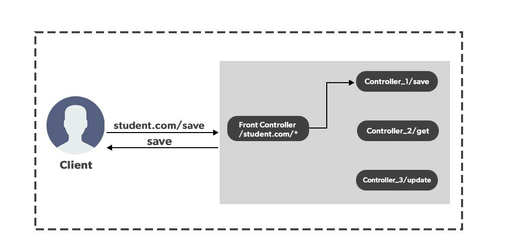 예를 들어서, student.com 이라는 웹사이트가 있고 클라이언트가 다음 student.com/save을 통해서 학생 데이터 저장을 요청한다고 가정하자. 그러면 먼저 프론트 컨트롤러인 가 student.com/* 경로로 들어오는 모든 요청을 처리한다. 이 요청이 프론트 컨트롤러에 대해서 수락되면 이 컨트롤러가 /save 작업에 대한 요청을 처리하고, Controller_1에 할당한다. 그런 다음 클라이언트에 응답을 다시 반환해준다.